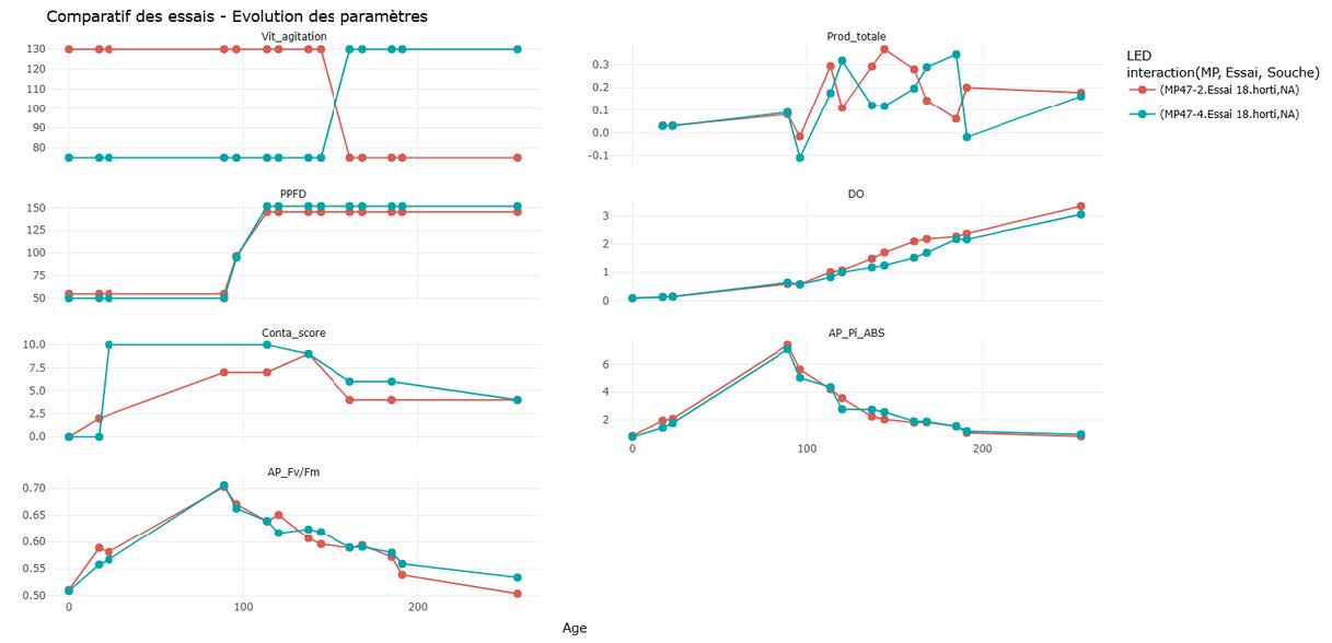 - Mesures biologiques et physico-chimiques : densité optique, efficience photosynthétique (Aquapen / Fluropen), observations microscopiques